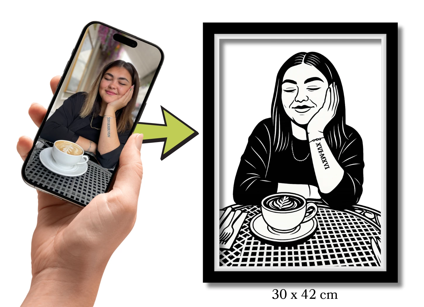 Das personalisierte Sandbild wird in unserem Werk gestaltet, standardmäßig in Schwarz und Weiß gefertigt und anschließend als fertiges Sandbild an dich versendet.